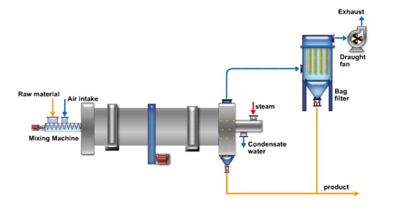 The steam rotary dryer is equipped with a steam heating pipe in the conventional rotary dryer. The heating pipe runs through the whole dryer and rotates with the cylinder. The material entering the rotary cylinder is lifted and stirred by the heating pipe in the rotating drum, and dried by the heat provided by the heating pipe. The dried product is moved from the higher end to the lower end by the inclination of the dryer and discharged from the discharging port at the lower end. And the vaporized water is discharged under the action of the fan. For the organic solvent, a closed type steam rotary dryer can be used, and the organic solvent is recovered by circulating the inert gas to prevent explosion.